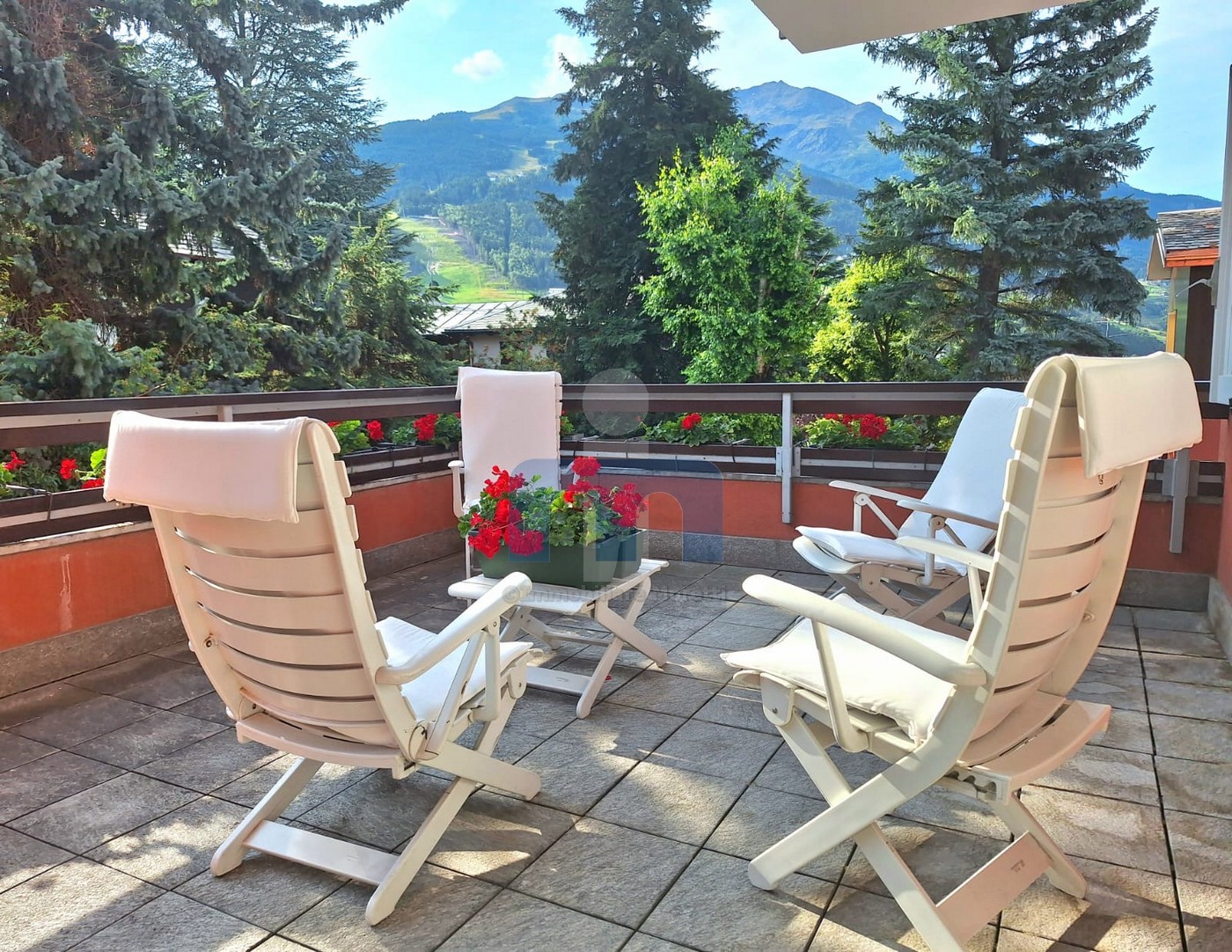 Il vero gioiello è il panoramico terrazzo, ideale per godersi momenti di relax con vista mozzafiato. Completano la proprietà due posti auto coperti nell’autorimessa comune e due spazi dedicati al deposito sci. Gli splendidi giardini comuni sono curati con attenzione, grazie alla presenza di un custode che garantisce una perfetta manutenzione ed estetica.